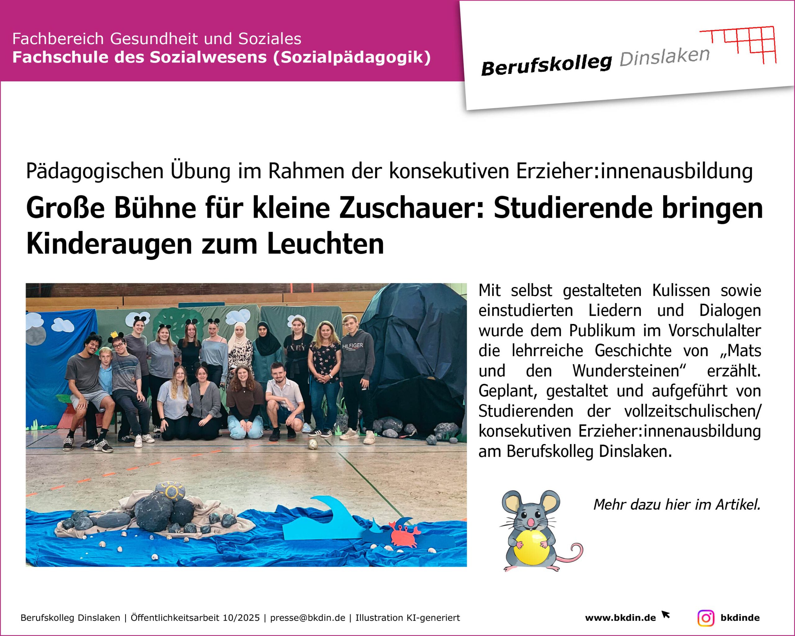 Pädagogische Übung im Rahmen der konsekutiven Erzieher:innenausbildung Große Bühne für kleine Zuschauer: Studierende bringen Kinderaugen zum Leuchten Mit selbst gestalteten Kulissen sowie einstudierten Liedern und [ Zum vollständigen Artikel … ]